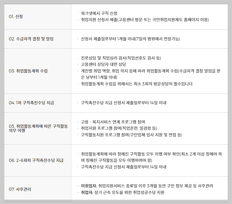 1개월 이내 수급자격이 결정되며, 해당되시는 분들은 이후 고용센터 상담자를 통해 취업활동계획수립을 3회 실시하며, 14일 이내 1차 구직촉진수당을 지급받습니다. 또한 고용, 복지프로그램에 참여하게 되며, 2~6회 차 구직촉진수당을 지급받게 됩니다.