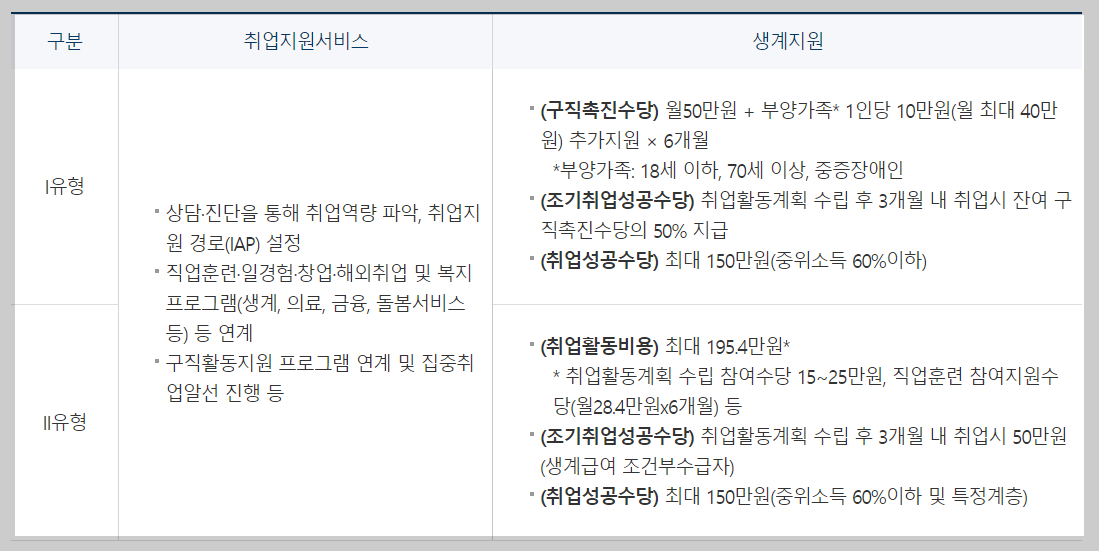 I유형에 해당하지 않는 특정계층*, 청년, 중장년 등이 지원 대상으로 '취업활동비용'과 '취업지원서비스'를 제공받게 됩니다.