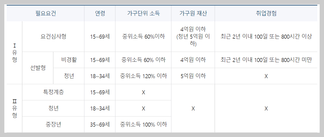 가구단위 중위소득60%이하이고, 재산 4억 원(18~34세 청년은 5억 원) 이하이면서, 최근 2년 안에 100일 또는 800시간 이상 취업경험이 있다면 I유형에 해당이 되며, '구진촉진수당'과 '취업지원서비스'를 제공받게 됩니다.