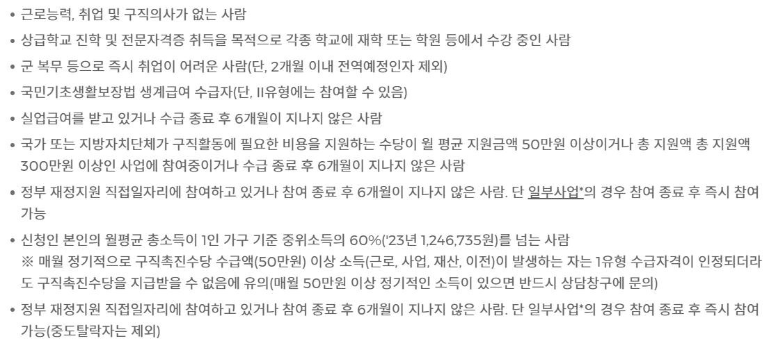 I유형에 참여할 수 없는 대상은 근로능력, 취업 및 구직의사가 없는 사람, 상급학교 진학 및 전문자격증 취득을 목적으로 학교에 재학 또는 학원 중인 사람등 아래 해당 되시는 분들은 참여하실 수 없습니다.