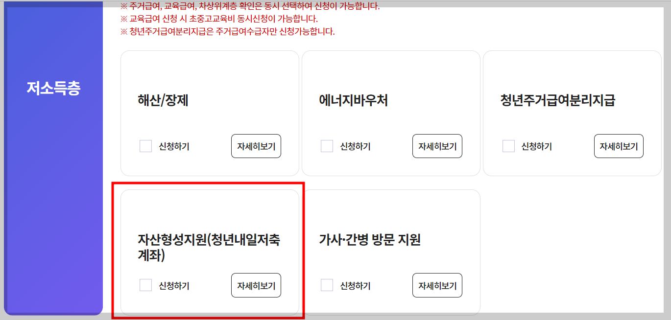 - 복지로 신청경로 : 복지로 로그인> 서비스신청> 복지서비스신청> 복지급여신청> 저소득층> 자산형성지원(청년내일저축계좌)