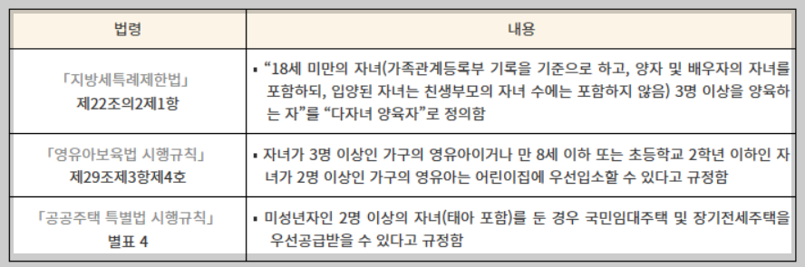하지만 개별 법령이나 정책 또는 지방자치단체별로 다자녀 가구 지원기준이 다를 수 있기 때문에 혜택을 신청 시 확인해 볼 필요가 있습니다.