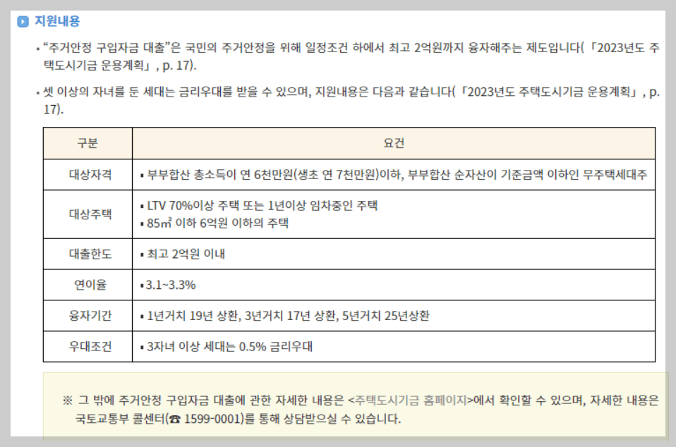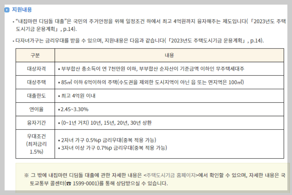 지원대상은 부부합산 소득 7천만원 이하인 경우 가능하며, 다자녀 우대조건으로 0.5% p, 3자녀 이상은 0.7%p금리우대 적용가능합니다.