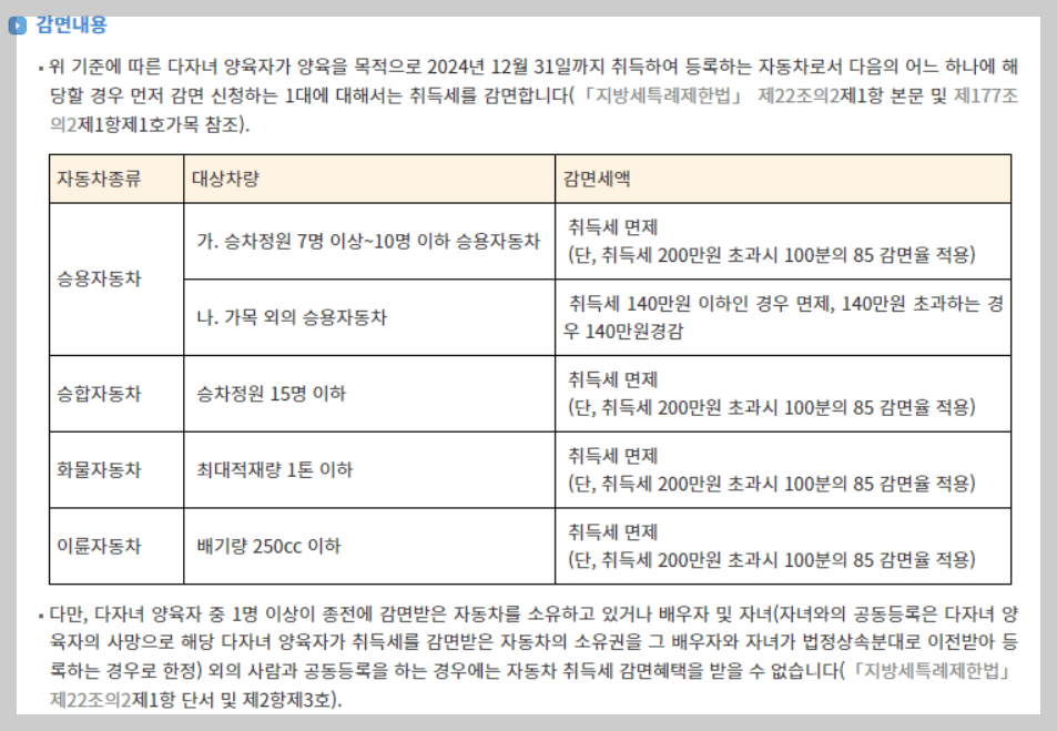 다자녀의 양육을 목적으로 2024년 12월 31일까지 차량 구입 시 자동차 종류에 따라 취득세 면제 또는 감면 혜택을 받을 수 있는데요. 자동차 취득세 140만 원까지 할인되며, 140만 원 이하인 경우 전액 면제받을 수 있어요!